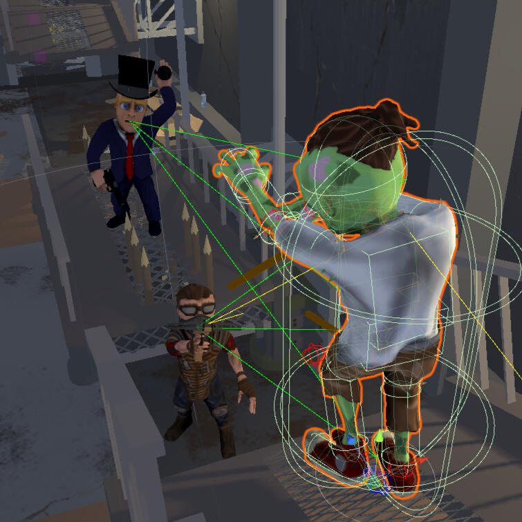 A twist on a classic 2.5D platformer, set in the middle of the zombie apocalypse. ZomNom was a fifteen week rapid-development project in Unity with a cross-discipline core team of six that aimed to create a finished and polished game to showcase our skills. I took on the role of lead programmer and applied my skills a wide range of features; principle gameplay programming, character and animation controllers, procedural joint animation for NPC aiming, a custom ambient soundscape system, custom Unity dev tools, NPC AI, weapon and environment VFX, complex physical interactions that give this platformer surprising gameplay depth, and much more.